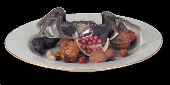 清乾隆·粉彩像生瓷果品盤。盤中諸果品不但酷似實(shí)物,而且都具有吉祥含義,如螃蟹寓意“一甲”,即科舉殿試第一;荔枝樹有“經(jīng)四百余年猶能結(jié)實(shí)者”之說,象征長壽;核桃、石榴是多子多福的象征;而棗、花生、瓜子等則寓意“早生貴子”。(圖片來源:故宮博物院)