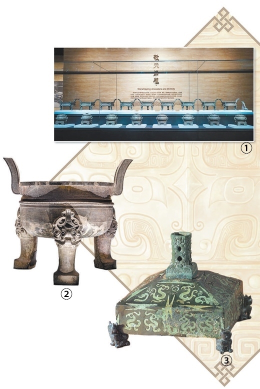 圖①:隨州曾侯乙墓出土的九鼎八簋。圖②:安徽博物院藏鑄客大鼎。圖③:紹興坡塘獅子山306號(hào)墓出土的方座形器。以上圖片均為張昌平提供