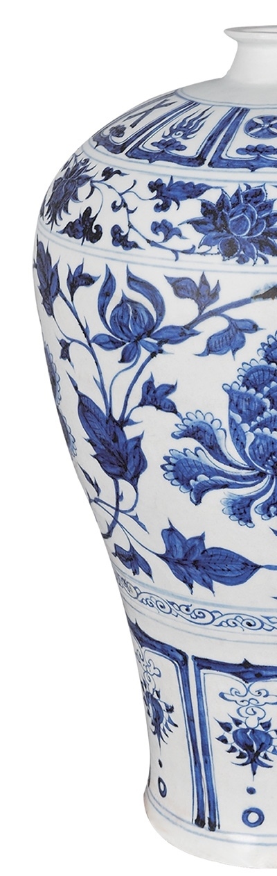 “元代的景德鎮(zhèn)制瓷匠從波斯進(jìn)口‘蘇麻離青’,也就是鈷藍(lán)料,經(jīng)高溫?zé)坪蟪尸F(xiàn)出了青花的典型色調(diào)?!别^長(zhǎng)彭國(guó)紅靠近展柜,指著梅瓶說(shuō)道:“青花料濃厚處有黑褐色鐵銹瑕疵,是因?yàn)檫@種原料中含有金屬元素,這是元代青花制品的特點(diǎn)之一?!?/p>