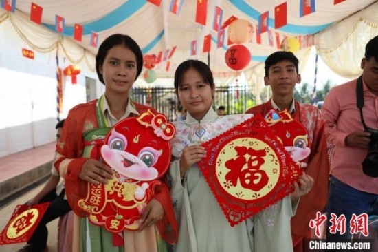 1月19日,“絲路心相通”春節(jié)文化交流活動(dòng)在茶膠省中柬友好扶貧示范村達(dá)弄村活動(dòng)中心舉辦,學(xué)生身穿漢服手拿福字,體驗(yàn)中國(guó)文化。項(xiàng)薪宇 攝