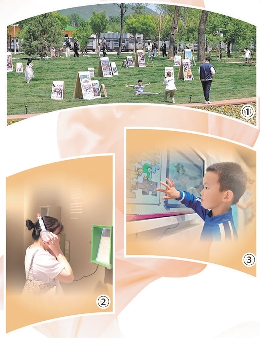 圖①:辛莊村藝術(shù)草坪上,游客在參觀打卡。