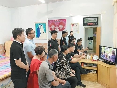 市民們聚在社區(qū)退役軍人服務(wù)站觀看新聞聯(lián)播。