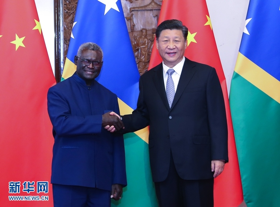 國家主席習(xí)近平9日在釣魚臺國賓館會見所羅門群島總理索加瓦雷。