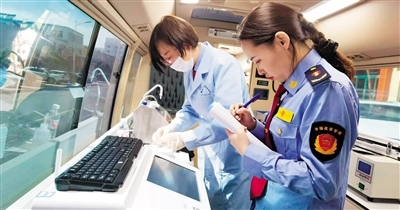 市場監(jiān)督管理局的檢測人員正在對食品進行檢查。