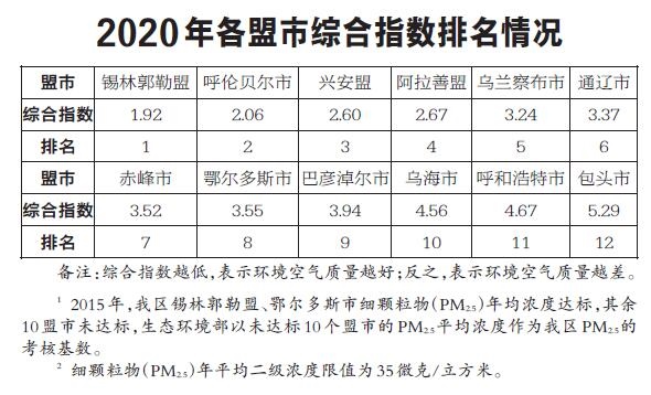 2020年1—12月,全區(qū)環(huán)境空氣質(zhì)量優(yōu)良天數(shù)比例平均為90.8%。12個盟市優(yōu)良天數(shù)比例由高至低依次為:呼倫貝爾市(100.0%)、錫林郭勒盟(98.9%)、興安盟(97.0%)、赤峰市(95.1%)、阿拉善盟(94.8%)、烏蘭察布市(94.8%)、通遼市(91.0%)、鄂爾多斯市(90.7%)、巴彥淖爾市(84.1%)、烏海市(83.1%)、呼和浩特市(80.3%)和包頭市(79.5%)。