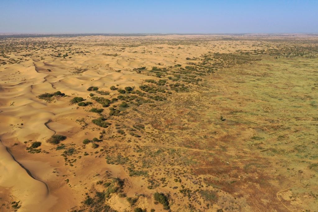 牧民寶音德力格爾家附近的庫(kù)布其沙漠(無(wú)人機(jī)照片)。新華社記者 李志鵬攝