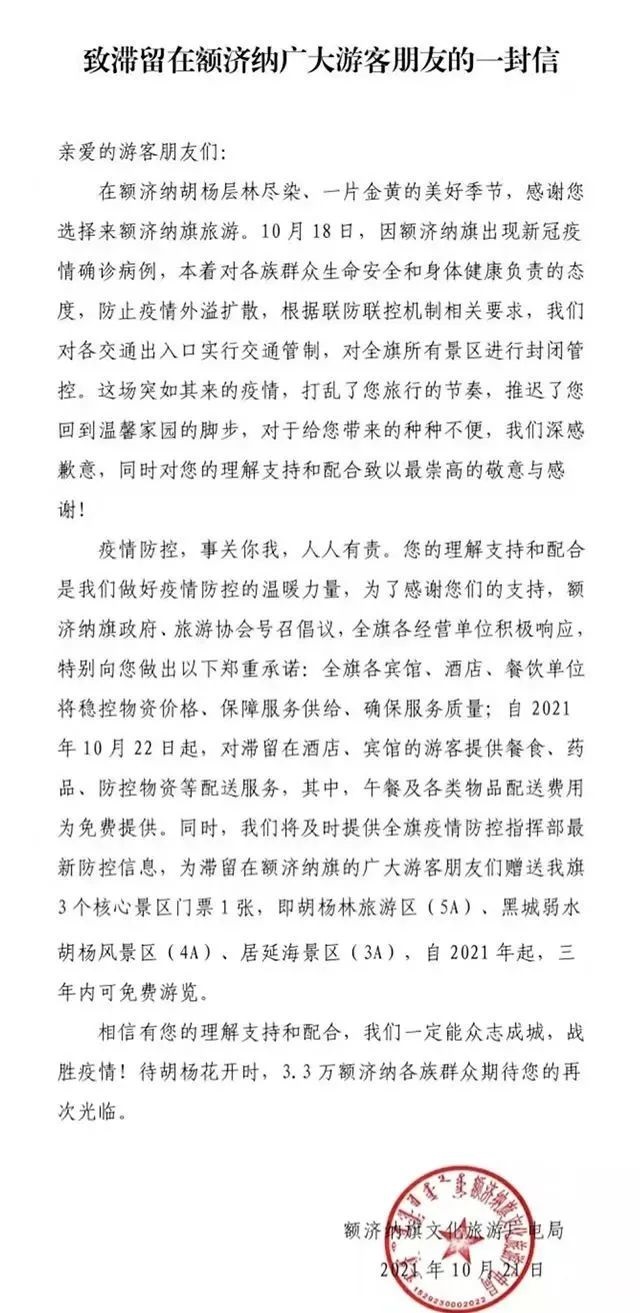這封公開信中寫道,自10月22日起,對滯留在酒店、賓館的游客提供餐食、藥品、防控物資等配送服務(wù),其中,午餐及各類物品配送費用為免費提供;為滯留游客贈送胡楊林旅游區(qū)(5A)、黑城弱水胡楊風景區(qū)(4A)、居延海景區(qū)(3A)3個核心景區(qū)門票1張,自2021年起,三年內(nèi)可免費游覽。