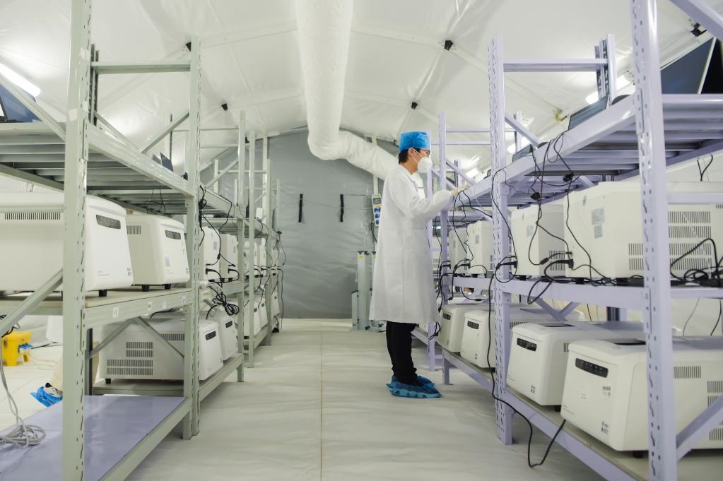 12月3日,工作人員在“獵鷹號”硬氣膜實(shí)驗(yàn)室進(jìn)行核酸檢測。新華社記者達(dá)日罕 攝
