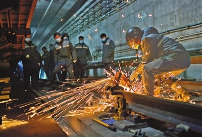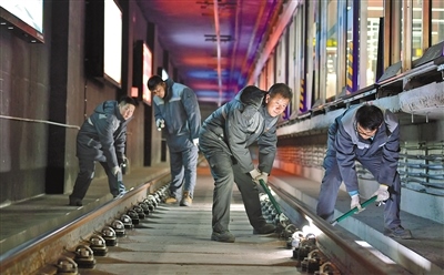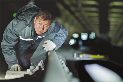 昏暗、逼仄的軌行區(qū)內(nèi),軌道檢修師們焊接鋼軌時迸發(fā)的火花顯得格外耀眼,維修軌道設備時敲擊鋼軌的聲音顯得格外清脆、響亮。據(jù)田智宏介紹,一個軌道檢修師每次夜間軌行區(qū)的巡檢作業(yè)大約要走7公里路程。他和工友們每天要檢查數(shù)千個部件,測量上百個數(shù)據(jù),其中一項重要巡檢工作就是檢查扣件和接頭聯(lián)結零件的組成部件是否安裝牢固,螺栓是否松動。他指了指自己腳上的鞋說:“我們的檢修對象不僅笨重且危險性較高,為了防止腳部受到傷害,鞋子都是特制的防砸絕緣鞋?!?/p>