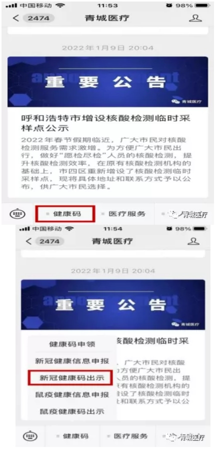 打開青城醫(yī)療微信公眾號,點擊“健康碼”選擇“新冠健康碼出示”。
