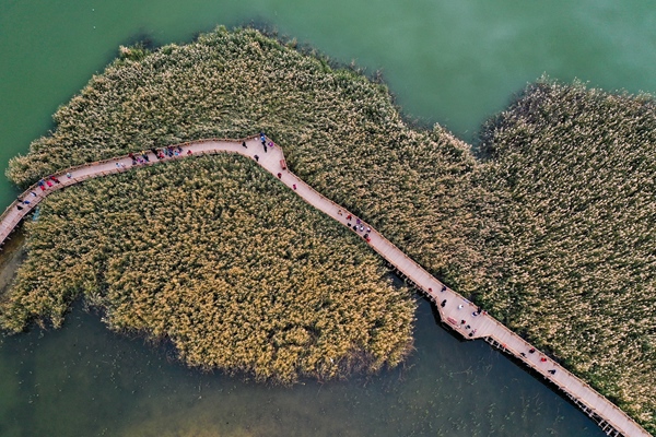 2021年10月17日,游客在居延海景區(qū)游玩(無人機照片)。新華社記者 劉磊 攝
