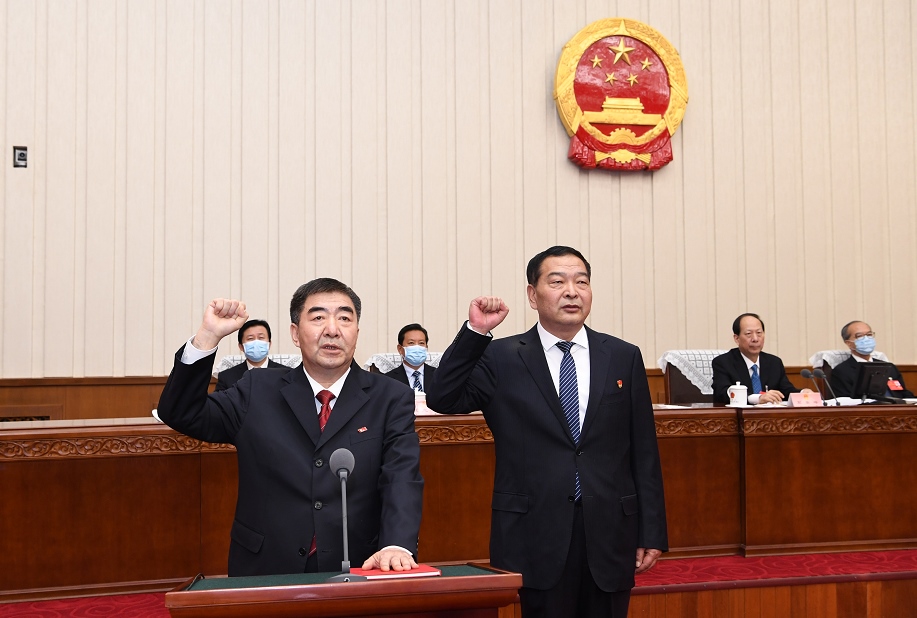 3月29日下午,自治區(qū)十三屆人大常委會第三十四次會議舉行了憲法宣誓儀式。自治區(qū)黨委書記、人大常委會主任石泰峰主持并監(jiān)誓。圖為新任職人員依法進(jìn)行憲法宣誓。