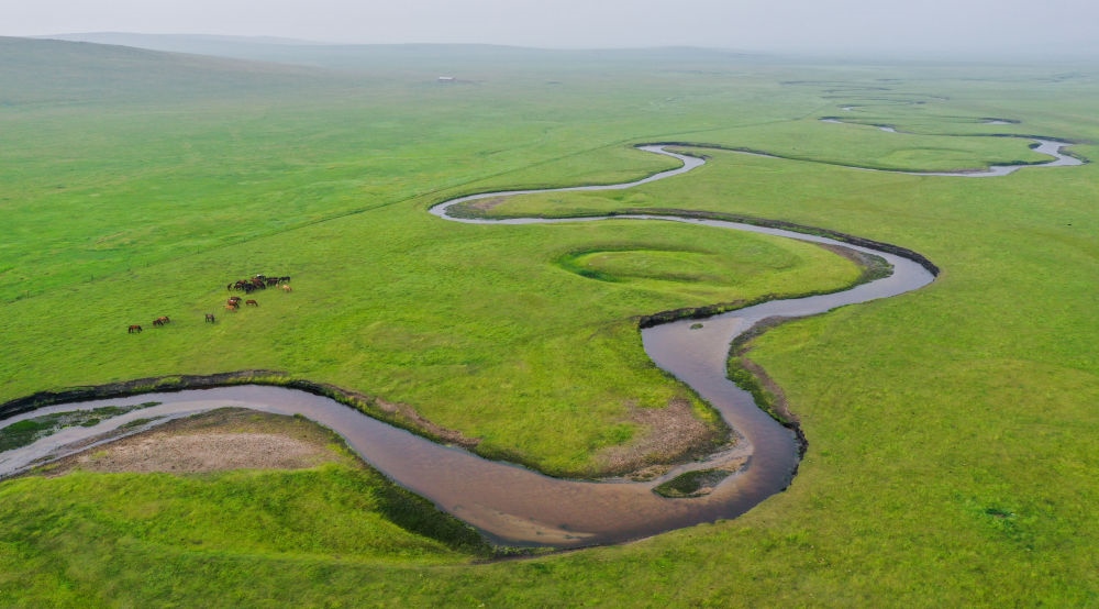 這是內(nèi)蒙古錫林郭勒盟東烏珠穆沁旗乃林高勒的草原風(fēng)光(2021年7月12日攝,無人機照片)。新華社記者連振攝