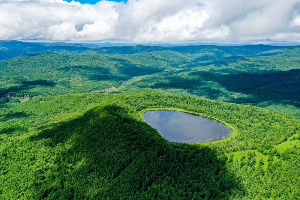 這是內(nèi)蒙古阿爾山天池風(fēng)光(2021年7月14日攝,無人機照片)。新華社記者連振攝
