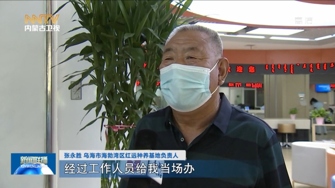 張永勝 烏海市海勃灣區(qū)紅遠(yuǎn)種養(yǎng)基地負(fù)責(zé)人 我原來想的辦這個(gè)東西挺費(fèi)勁,經(jīng)過工作人員給我當(dāng)場(chǎng)辦,比我想象的還要快,我非常高興。