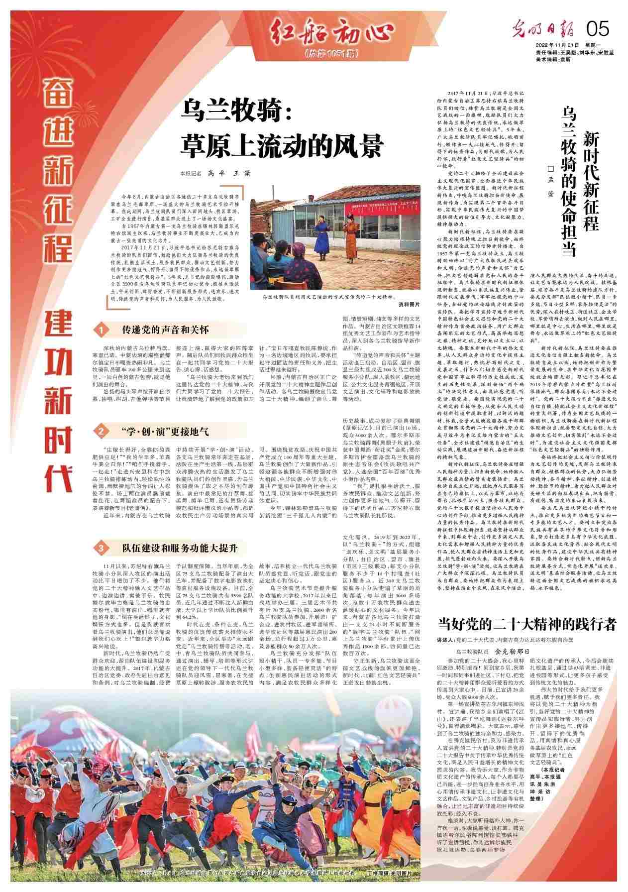 2017年11月21日,習(xí)近平總書記給蘇尼特右旗烏蘭牧騎的隊員們回信,勉勵他們大力弘揚烏蘭牧騎的優(yōu)良傳統(tǒng),扎根生活沃土,服務(wù)牧民群眾,推動文藝創(chuàng)新,努力創(chuàng)作更多接地氣、傳得開、留得下的優(yōu)秀作品,永遠做草原上的“紅色文藝輕騎兵”。5年來,總書記的殷殷囑托,激勵全區(qū)3500多名烏蘭牧騎隊員牢記初心使命、根植生活沃土,守正創(chuàng)新、踔厲奮發(fā),不斷創(chuàng)新服務(wù)形式,送歡樂、送文明,傳遞黨的聲音和關(guān)懷,為人民服務(wù)、為人民放歌。
