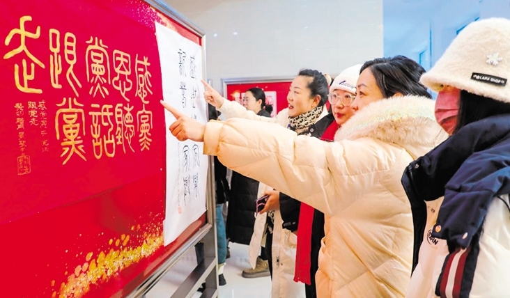 各類參展作品掛在以紅色為底的展板上,新年的氛圍感瞬間拉滿?!芭e辦這次活動特別有意義,真的很喜歡這種文化氛圍。”內(nèi)蒙古自治區(qū)第八屆道德模范獲得者鄭洪山邊看邊說。