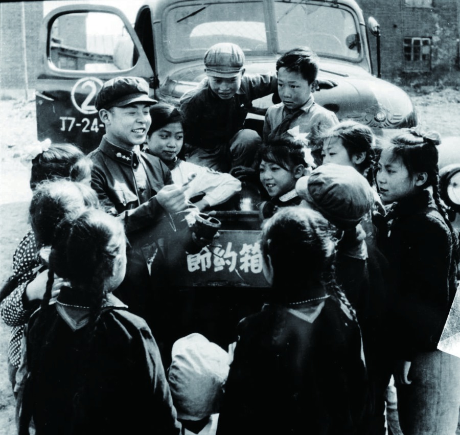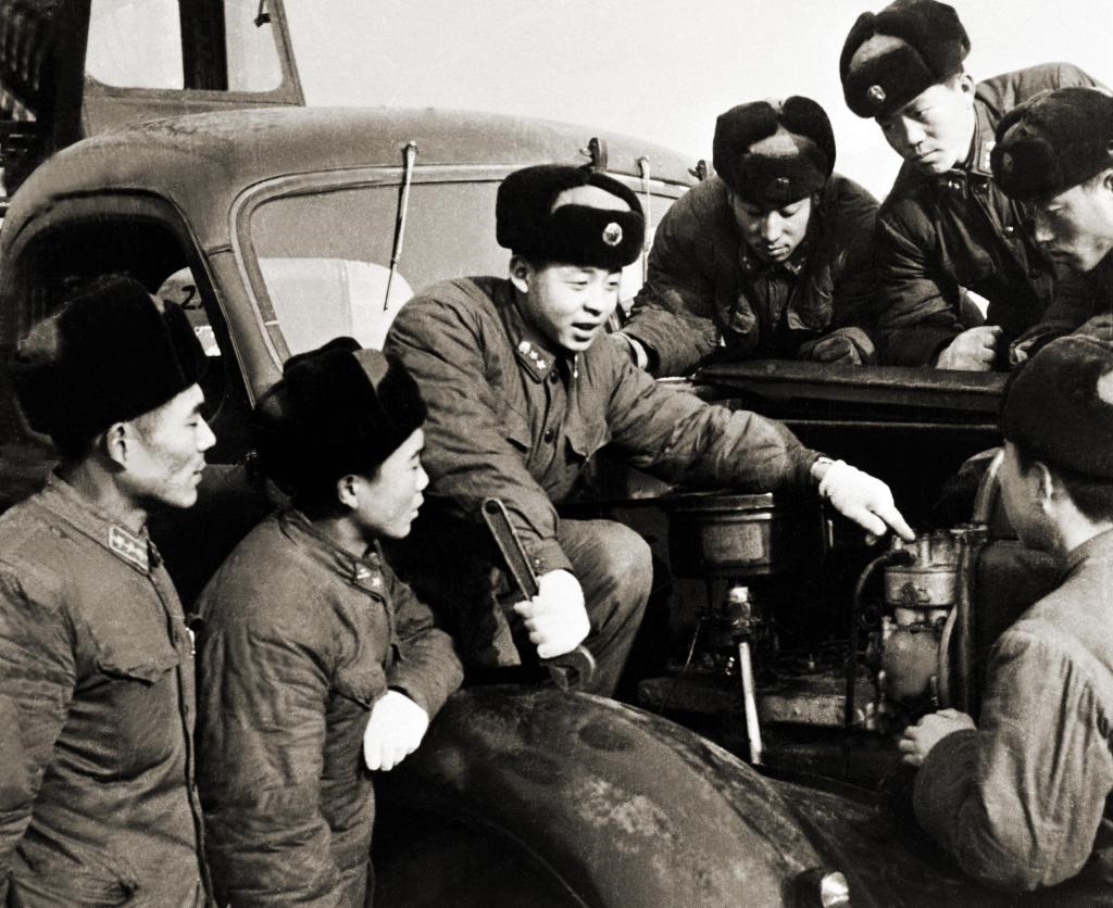 ↑雷鋒(左三)在向戰(zhàn)友們介紹節(jié)油經(jīng)驗(yàn)。