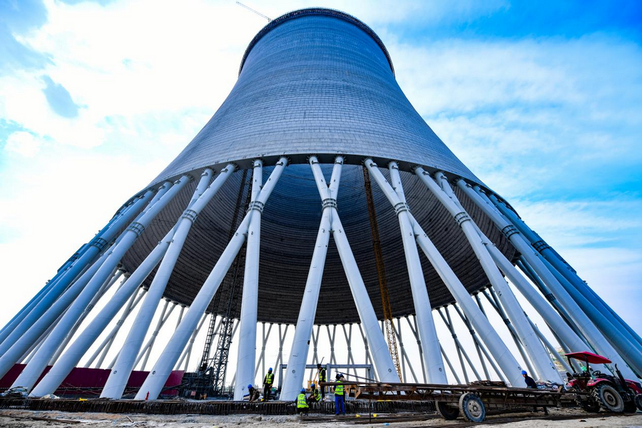 12月6日,在內(nèi)蒙古呼和浩特市土默特左旗內(nèi)蒙古能源集團(tuán)金山熱電三期項目建設(shè)現(xiàn)場,工人們正有序進(jìn)行著設(shè)備安裝等工作。進(jìn)入該項目間冷塔內(nèi)部,抬頭仰望,仿佛一只巨大的眼睛凝視,未來該項目投產(chǎn)后可實現(xiàn)年發(fā)電量100億千瓦時,新增供熱面積5000萬平方米,將溫暖送至千家萬戶。(楊鑫 攝)