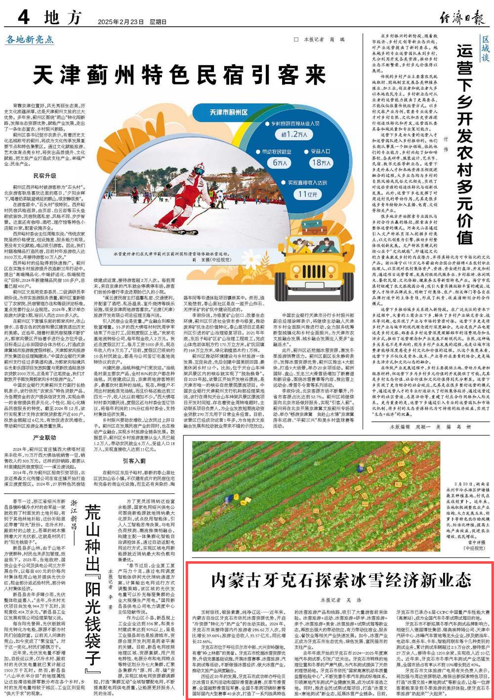 2025年2月23日,《經濟日報》第4版刊發(fā)題為《內蒙古牙克石探索冰雪經濟新業(yè)態(tài)》的 文章,報道了2024年內蒙古自治區(qū)牙克石市共接待國內外旅游者286.62萬人次,同比增長39.66%;旅游業(yè)總收入35.57億元,同比增長22.66%。