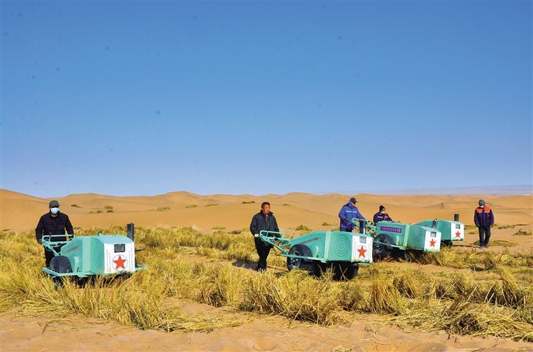 在巴丹吉林、騰格里兩大沙漠交匯處的九棵樹項目區(qū)現(xiàn)場,在連綿起伏的沙丘上,縱橫交錯的草方格將一個個沙丘分割并鎖定,工人們有的在起伏的沙丘上鋪稻草、壓沙障,有的操作小型壓沙機壓草方格,還有的在水車旁等待澆水。