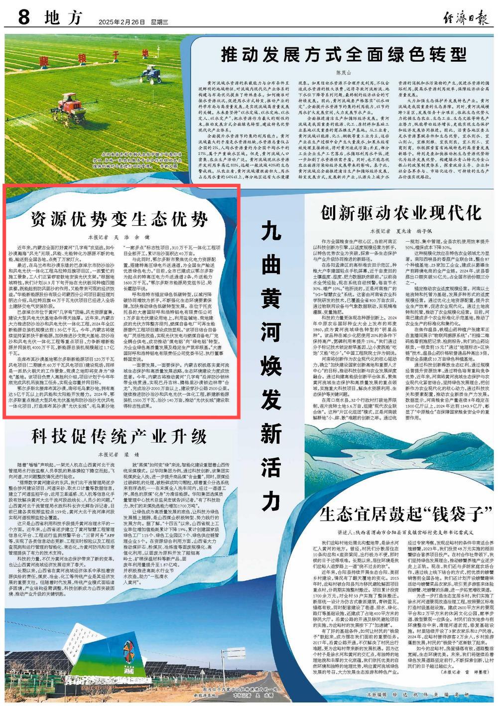 2025年2月26日,《經(jīng)濟日報》第8版刊發(fā)題為《資源優(yōu)勢變生態(tài)優(yōu)勢》的文章,報道了近年來,內(nèi)蒙古全面打好黃河“幾字彎”攻堅戰(zhàn),如今沙漠瀚海“風(fēng)光”無限,風(fēng)能、光能轉(zhuǎn)化為源源不斷的電能,輸送到全國各地,點亮了萬家燈火。