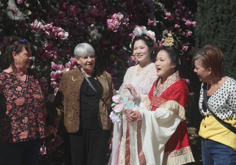 2025年3月1日,在美國(guó)伍德賽德的斐洛里莊園,漢服愛(ài)好者與游客在花朝節(jié)慶祝活動(dòng)上交流。新華社發(fā) 劉藝霖 攝