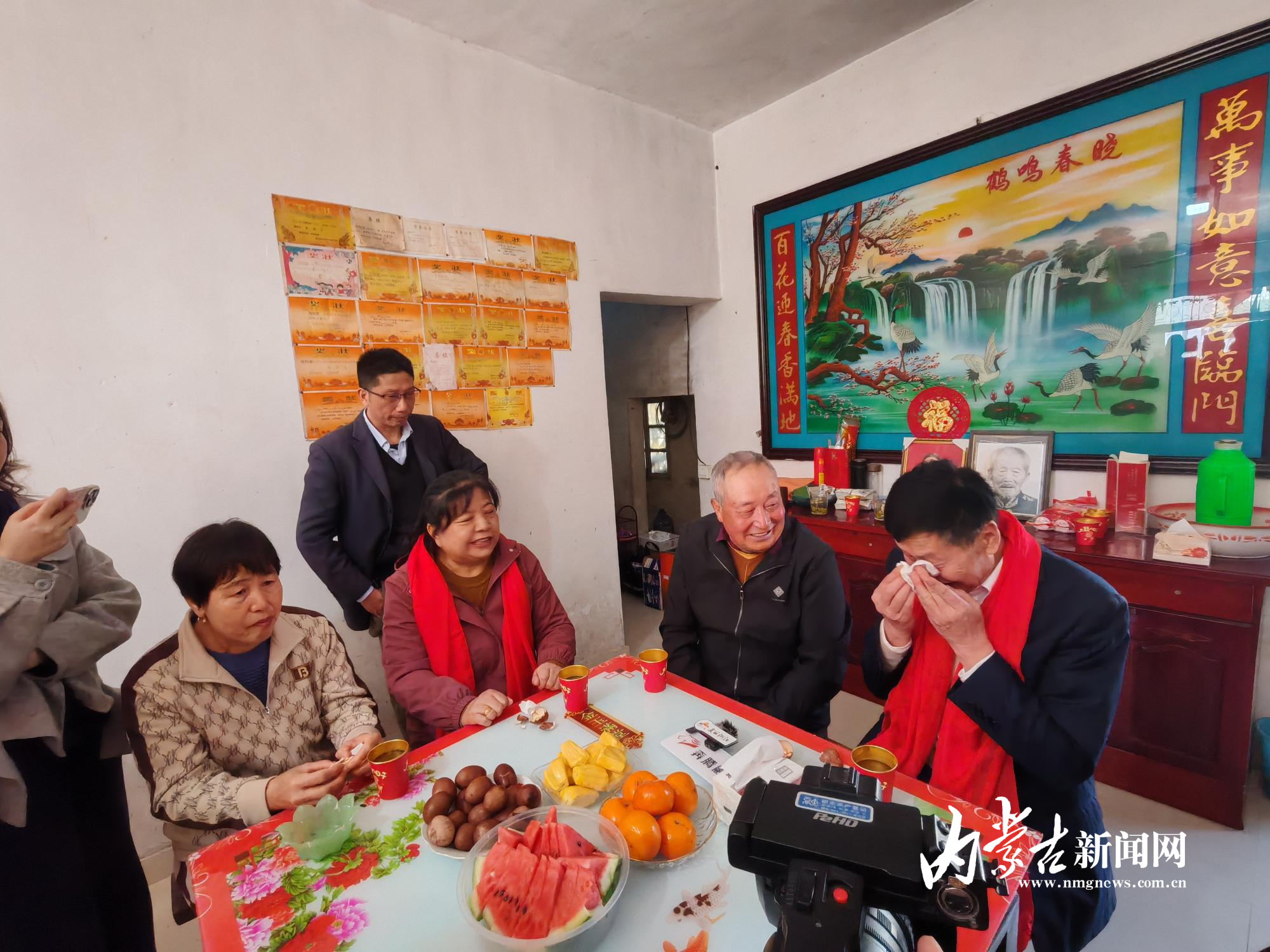 4月2日8時(shí),車隊(duì)從江陰市出發(fā),近兩小時(shí)后到達(dá)江蘇省溧陽(yáng)市上興鎮(zhèn)水西村。在這里,劉建軍年邁的哥哥、姐姐等親人早已打掃好老房子,焦急地等待著。車隊(duì)緩緩駛?cè)氪謇铮芗依险T口鞭炮聲震天。84歲的周菊仙、75歲的周全根與闊別65年的弟弟抱頭痛哭。
