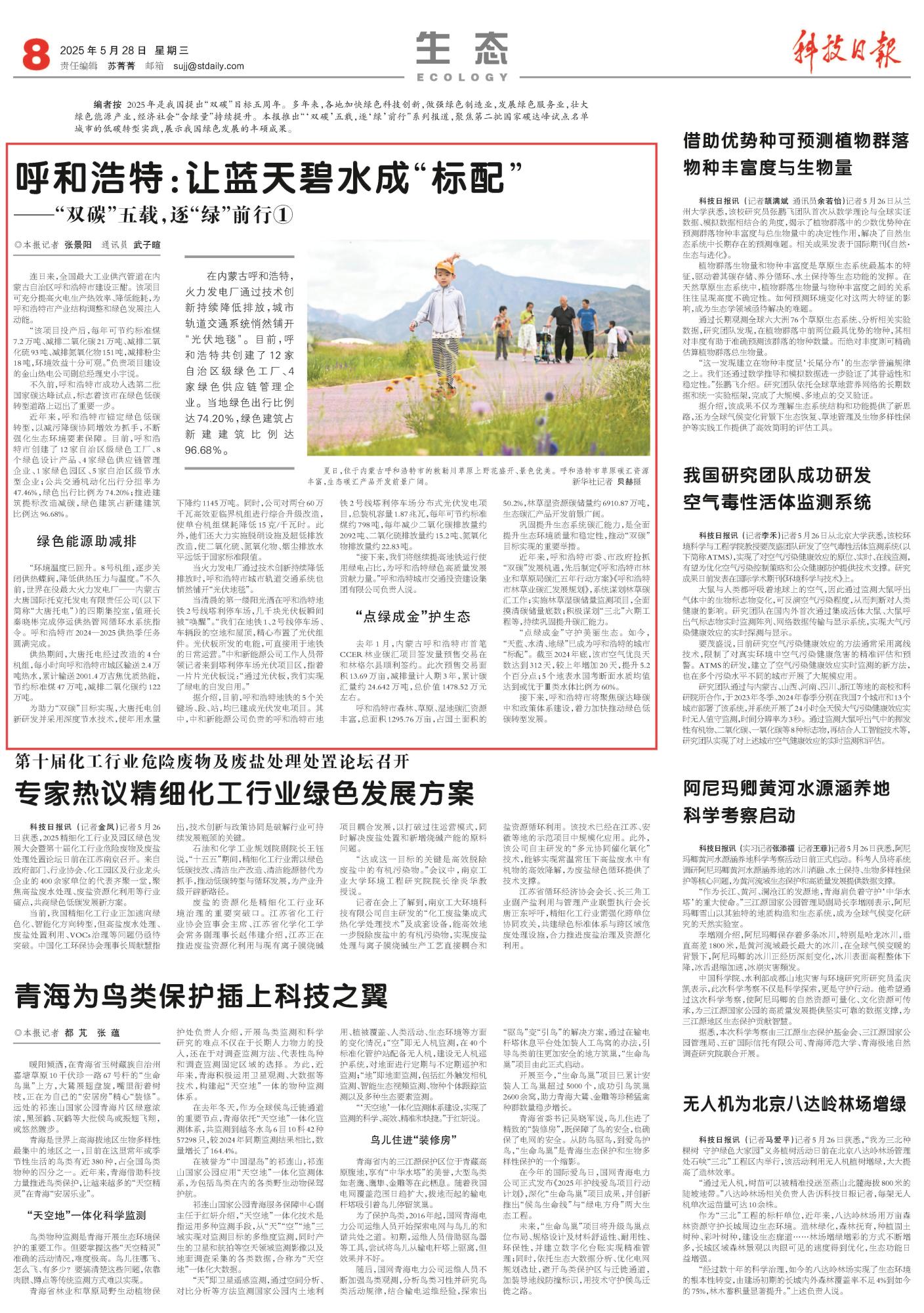 2025年5月28日,《科技日報》第8版刊發(fā)了《呼和浩特:讓藍天碧水成“標配”——“雙碳”五載,逐“綠”前行①》的文章,報道了內(nèi)蒙古呼和浩特“點綠成金”守護美麗生態(tài)?;鹆Πl(fā)電廠通過技術(shù)創(chuàng)新持續(xù)降低排放,城市軌道交通系統(tǒng)悄然鋪開“光伏地毯”?!疤焖{、水清、地綠”已成為呼和浩特的城市“標配”。