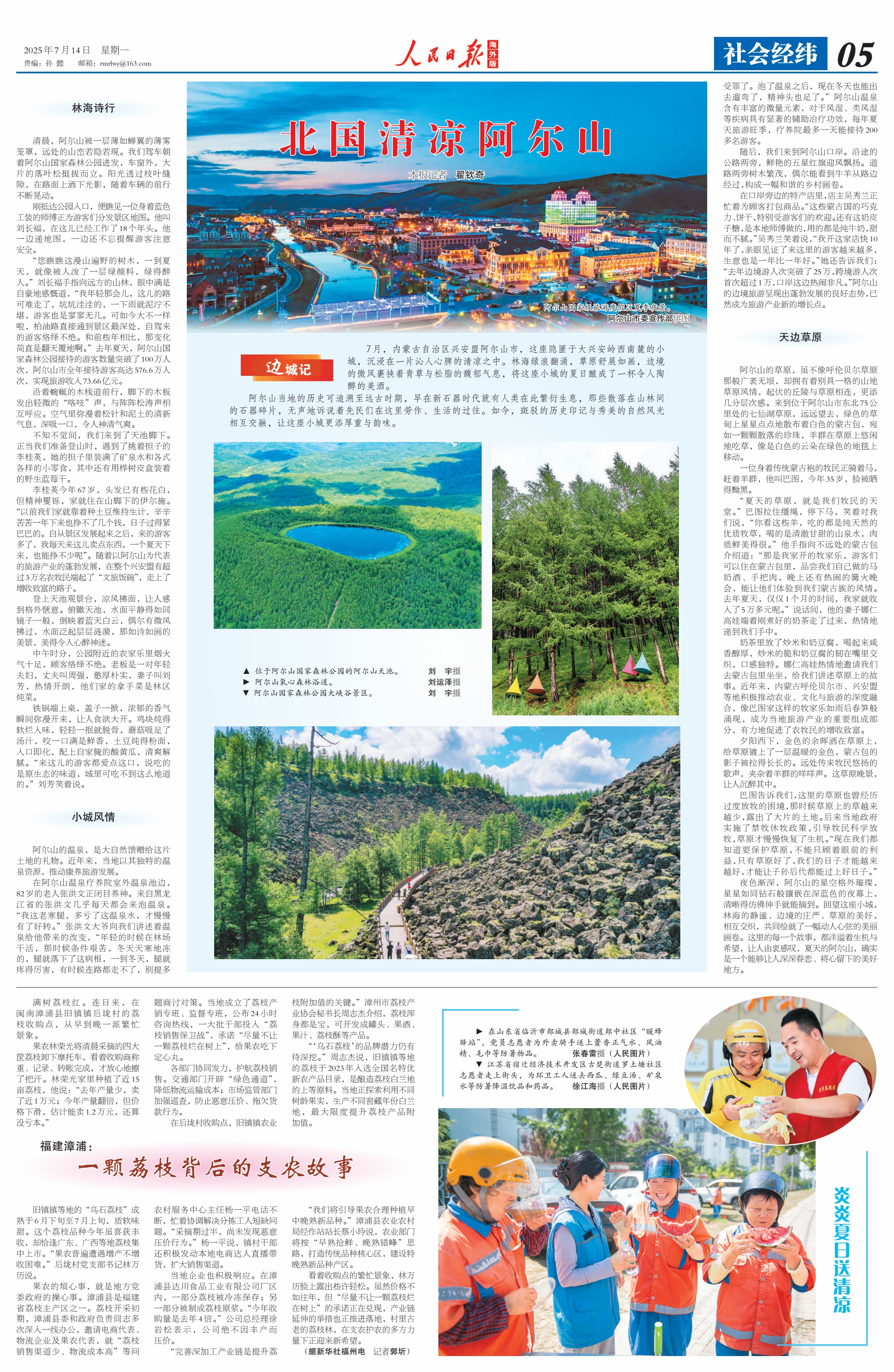 2025年7月14日《人民日?qǐng)?bào)海外版》第5版刊發(fā)了題為《北國(guó)清涼阿爾山》的文章,報(bào)道了7月,內(nèi)蒙古自治區(qū)興安盟阿爾山市,這座隱匿于大興安嶺西南麓的小城,沉浸在一片沁人心脾的清涼之中。林海綠浪翻涌,草原舒展如畫(huà),邊境的微風(fēng)裹挾著青草與松脂的馥郁氣息,將這座小城的夏日釀成了一杯令人陶醉的美酒。