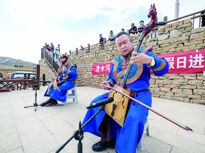 在內(nèi)蒙古自治區(qū)呼和浩特市清水河縣老牛灣村,身穿民族服裝的工作人員在演奏民族樂器。新華社發(fā)