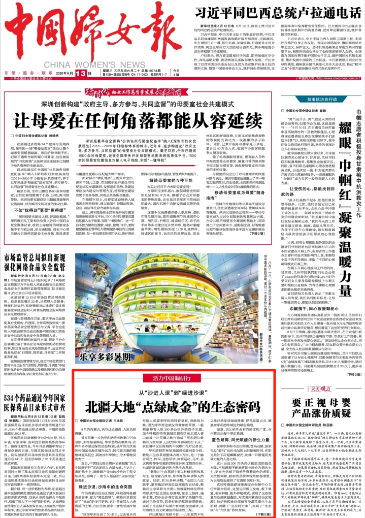 2025年8月13日,《中國婦女報(bào)》第1版刊發(fā)題為《從“沙進(jìn)人退”到“綠進(jìn)沙退” 北疆大地“點(diǎn)綠成金”的生態(tài)密碼》的文章,報(bào)道了“活力中國調(diào)研行”采訪團(tuán)深入內(nèi)蒙古大地,在這片廣袤的熱土上,新能源產(chǎn)業(yè)與防沙治沙工程交織共生,奏響了一曲令人振奮的“點(diǎn)綠成金”協(xié)奏曲。