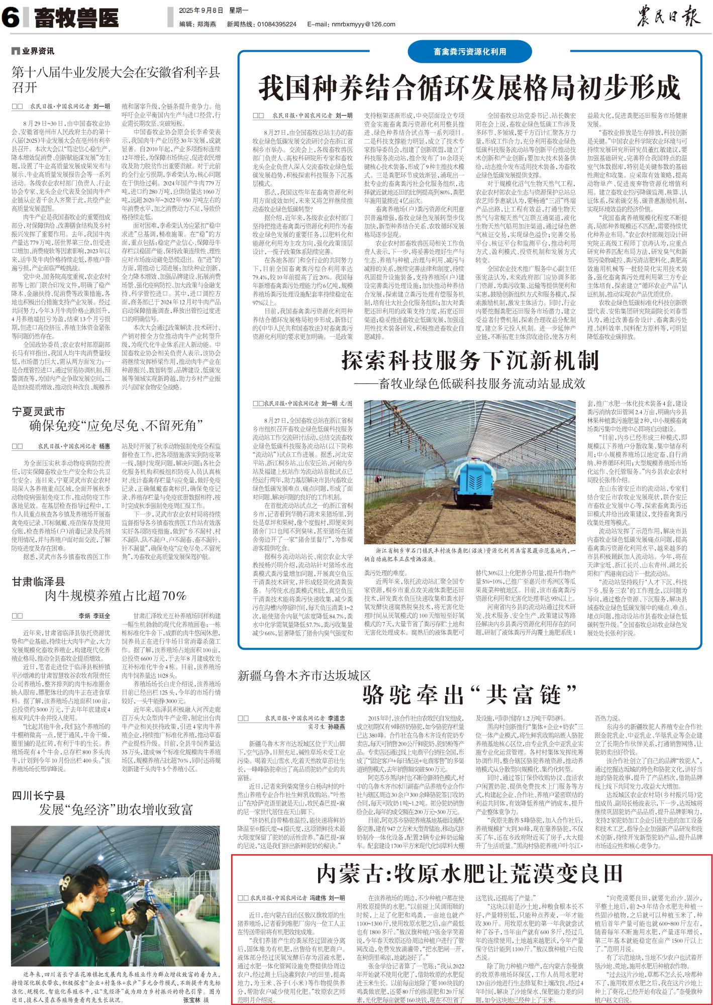 2025年9月8日,《農(nóng)民日報(bào)》第6版整版刊發(fā)題為《內(nèi)蒙古:牧原水肥讓荒漠變良田》的文章,報(bào)道了在內(nèi)蒙古奈曼旗的牧原養(yǎng)殖場環(huán)保區(qū),工作人員用水肥對120畝沙地進(jìn)行生態(tài)修復(fù)和土壤改良,經(jīng)過4年時間,解決了沙地保水、保肥能力差的問題,如今這塊地已經(jīng)種上了玉米。