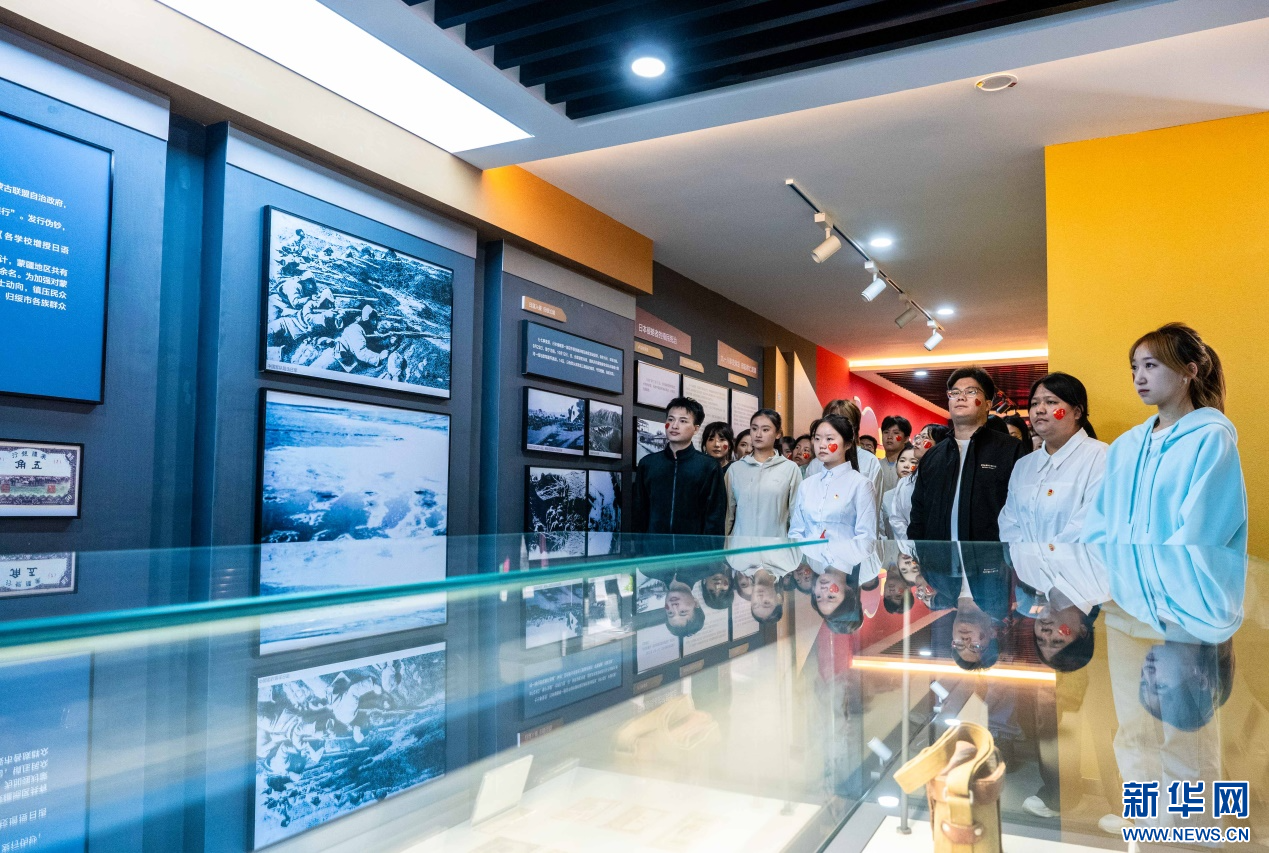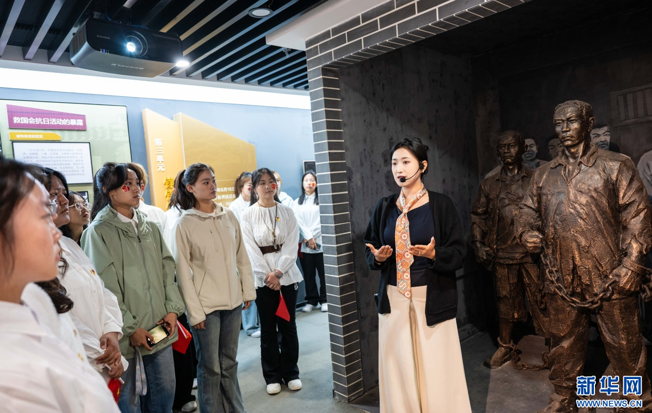 ??10月1日,內(nèi)蒙古師范大學(xué)馬克思主義學(xué)院的學(xué)子們在綏蒙各界抗日救國會舊址紀念館參觀研學(xué)。新華網(wǎng)發(fā)(丁根厚 攝)