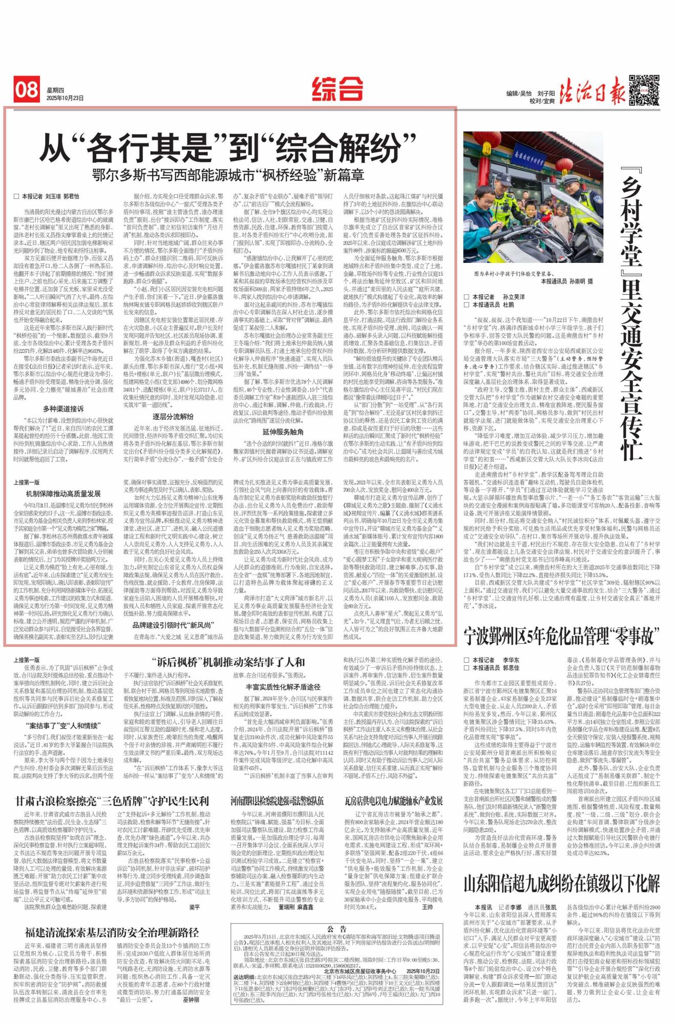 2025年10月23日,《法治日?qǐng)?bào)》第8版刊發(fā)題為《從“各行其是”到“綜合解紛”鄂爾多斯書(shū)寫(xiě)西部能源城市“楓橋經(jīng)驗(yàn)”新篇章》的文章,報(bào)道了鄂爾多斯市以綜治中心規(guī)范化建設(shè)為核心,深入踐行新時(shí)代“楓橋經(jīng)驗(yàn)”,通過(guò)多元舉措化解矛盾糾紛,全力打造“暖城善治”社會(huì)治理品牌。截至9月底,全市各級(jí)綜治中心累計(jì)受理各類(lèi)矛盾糾紛22371件,化解率達(dá)96.03%。