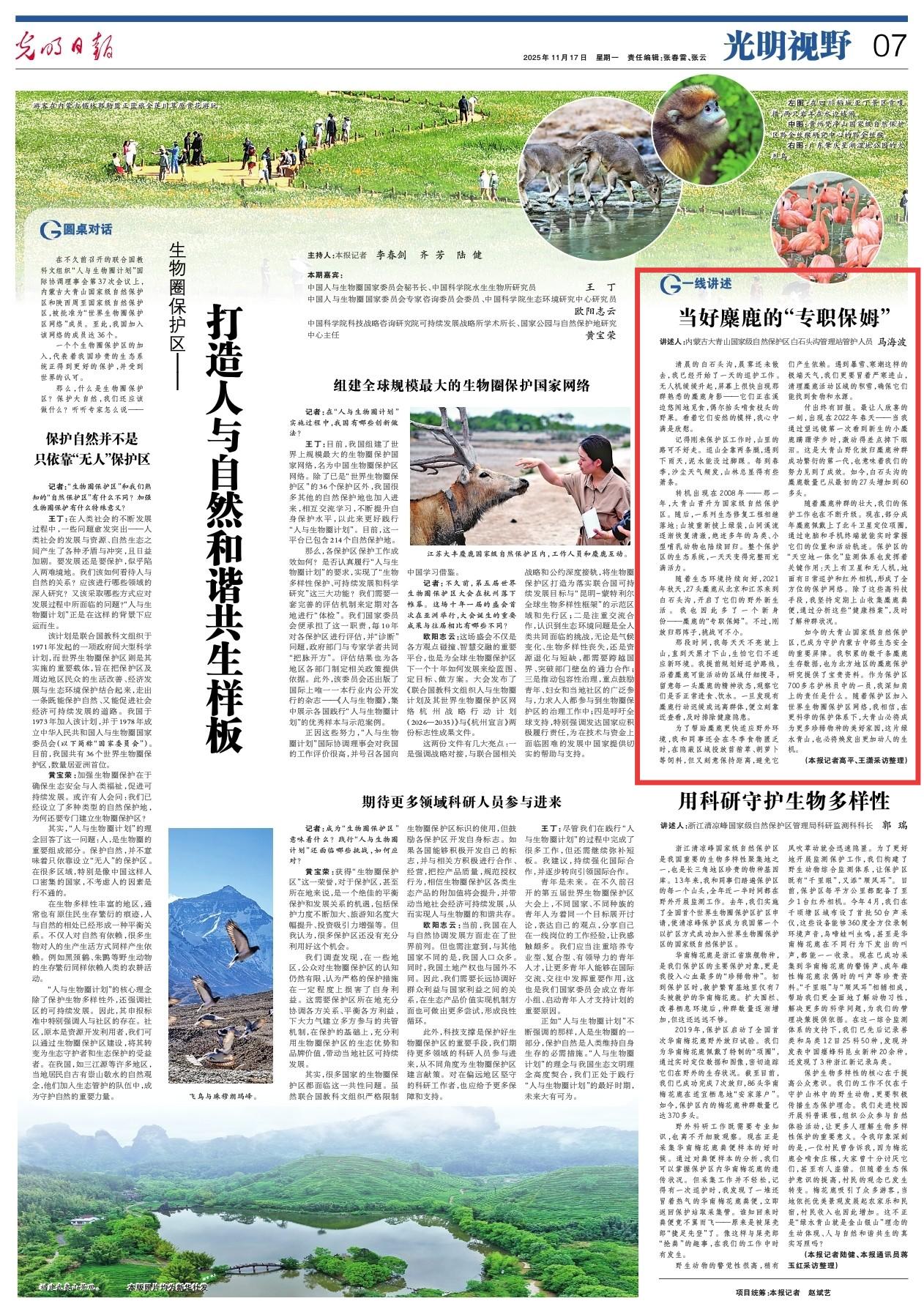 2025年11月17日,《光明日?qǐng)?bào)》第7版刊發(fā)題為《當(dāng)好麋鹿的“專(zhuān)職保姆”》的文章,以?xún)?nèi)蒙古大青山國(guó)家級(jí)自然保護(hù)區(qū)白石頭溝管理站管護(hù)人員馬海波的視角,講述當(dāng)好麋鹿的“專(zhuān)職保姆”的故事,如今白石頭溝的麋鹿數(shù)量已從最初的27頭增加到60多頭。