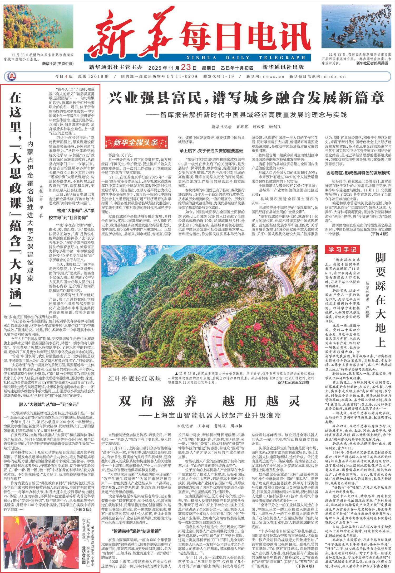 2025年11月23日,《新華每日電訊》頭版刊發(fā)題為《在這里,“大思政課”蘊含“大內涵”——內蒙古伊金霍洛旗推進大思政課建設觀察》的文章,報道了內蒙古自治區(qū)鄂爾多斯市伊金霍洛旗立足地區(qū)實際,推行“思享伊旗”大思政課建設,構建起多維體系,不斷拓展思政教育的廣度、深度和溫度,更加有機融入社會肌理。