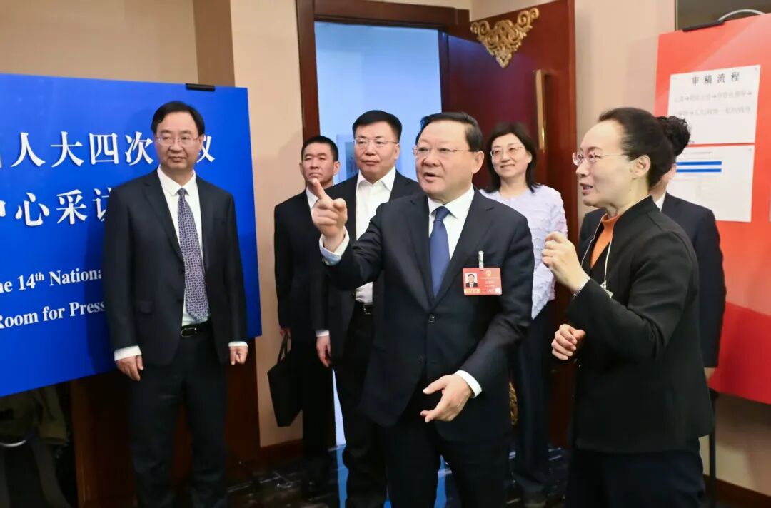3月6日,自治區(qū)黨委書記、人大常委會主任王偉中,自治區(qū)黨委副書記、自治區(qū)人民政府主席包鋼在內(nèi)蒙古日報社兩會報道工作間與記者代表親切交流,詳細(xì)了解宣傳報道情況。草原云·內(nèi)蒙古新聞網(wǎng)記者 馬建兵 攝