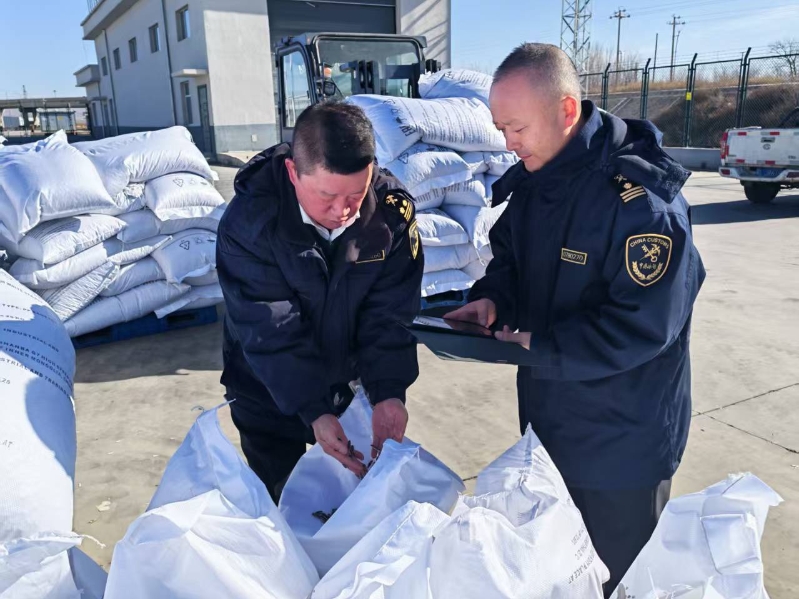 集寧海關(guān)關(guān)員對(duì)出口葵花籽進(jìn)行現(xiàn)場(chǎng)查驗(yàn)