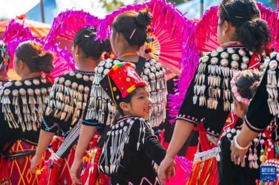 3月2日,參加目瑙縱歌節(jié)的小朋友跟著大人們一起進(jìn)場舞蹈。