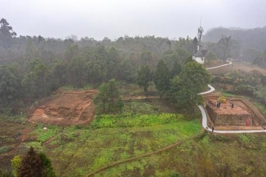 這是2月9日在重慶合川釣魚城遺址拍攝的新發(fā)掘出的類似闕臺建筑的基址(無人機照片)。新華社記者 黃偉 攝