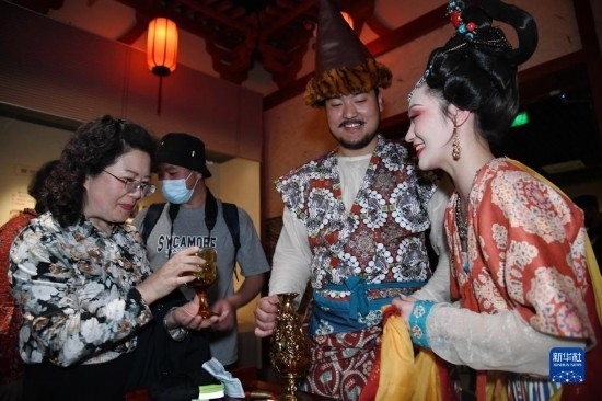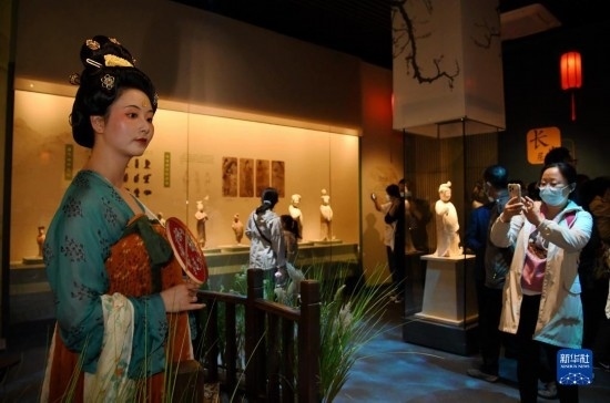 5月22日晚,在西安博物院《長安有故里——絲路少年大唐行》展覽上,身著復(fù)原唐裝的演員與游客互動(dòng)。