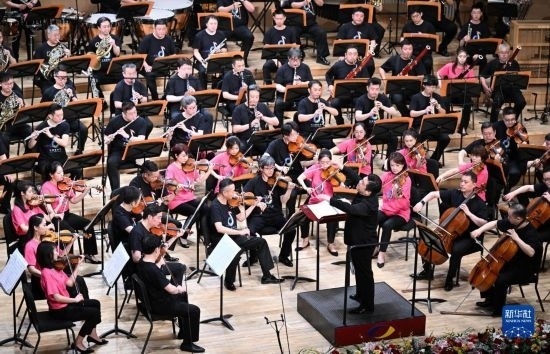 5月25日,在天津大劇院音樂廳,由天津歌舞劇院、天津交響樂團(tuán)等組成的天津百人聯(lián)合樂團(tuán)在舞臺上演奏。