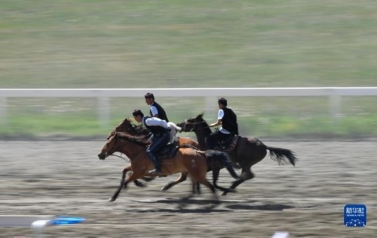 7月16日,牧民在開幕式上表演“叼羊”。