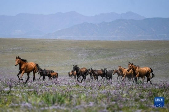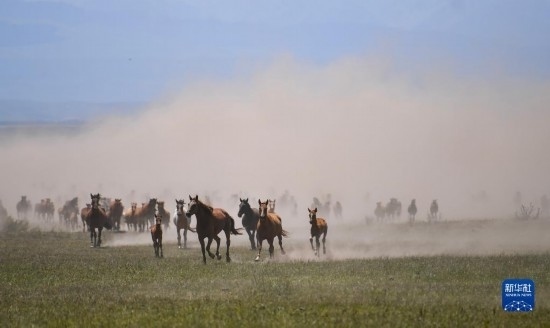 7月16日,牧民在昭蘇縣天馬旅游文化園的草原上遛馬。