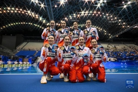 7月21日,中國隊在比賽中。當(dāng)日,在日本福岡舉行2023年世界游泳錦標(biāo)賽花樣游泳集體自由自選決賽中,中國隊以329.1687分的成績獲得冠軍。新華社記者 夏一方 攝