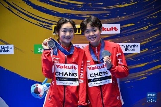 7月21日,冠軍中國選手陳藝文(右)和亞軍中國選手昌雅妮在頒獎儀式上。當(dāng)日,在日本福岡舉行的2023年世界游泳錦標(biāo)賽跳水女子單人三米板決賽中,中國選手陳藝文、昌雅妮分別以359.50分和341.50分的成績包攬冠亞軍。新華社記者 張笑宇 攝