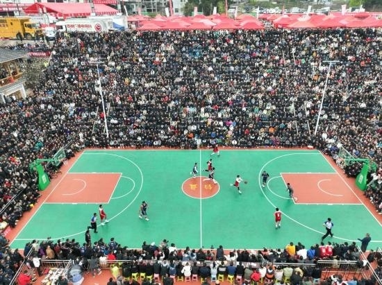 這是3月27日在貴州省黔東南州臺江縣臺盤村拍攝的貴州省首屆“美麗鄉(xiāng)村”籃球聯(lián)賽總決賽比賽現(xiàn)場(無人機照片)。新華社記者歐東衢攝
