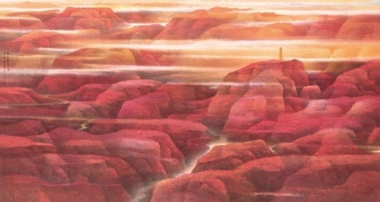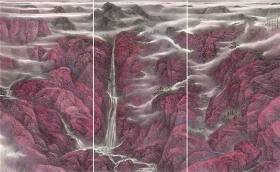 來(lái)自上海并深受海派畫(huà)學(xué)影響的樂(lè)震文、張弛,在宋元及明清山水畫(huà)學(xué)上打下了深厚的功底,也因此,他們的傳統(tǒng)山水畫(huà)深受日本民眾的歡迎。他們?cè)尉訓(xùn)|瀛多年,轉(zhuǎn)道再度研習(xí)了中國(guó)傳統(tǒng)文人畫(huà)。但真正改變他們畫(huà)風(fēng)的,卻是他們對(duì)中國(guó)北方大山大水的寫(xiě)生攬勝。他們鐘情于英雄的太行山,忘情于革命勝地陜北高原,力求通過(guò)壯闊雄渾的山巒、連綿逶迤的群峰來(lái)表達(dá)他們的時(shí)代感悟,營(yíng)構(gòu)儲(chǔ)存于他們胸中的山川氣象。所謂“山河回聲”,正是這些作品抒發(fā)的中華民族歷經(jīng)歲月風(fēng)華在大好河山之中回響的奮斗激情。