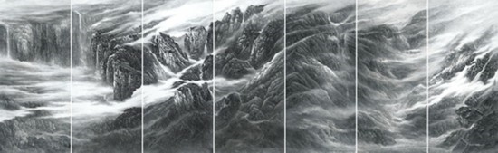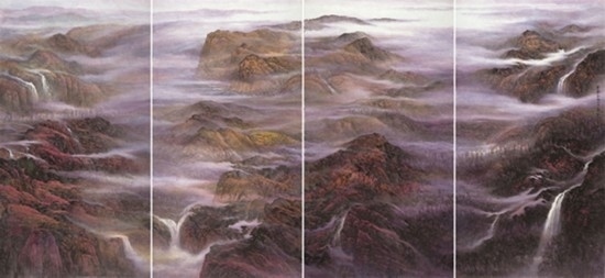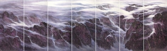 且看樂(lè)震文的《直上浮云》《云卷云舒》和《黃土馳風(fēng),日月星辰》,那逶迤茫茫的群山峻嶺,那縱橫畫(huà)面的云蒸霞蔚,那連綿不絕的箭樓城堞,哪里還是傳統(tǒng)文人山水畫(huà)的淡煙輕嵐,縹緲冷逸?濃縮于畫(huà)內(nèi)的精神意蘊(yùn),分明凸顯了現(xiàn)代山水畫(huà)對(duì)家國(guó)情懷的抒發(fā)。且讀張弛的《云起疊嶂》《惟余莽莽》和《紫氣氤氳》,那天光紫氣的浩渺煙云,那渾然一體的山水氣象,那千回百轉(zhuǎn)的流水飛泉,其實(shí)早已脫離了對(duì)自然山水的寫(xiě)照,而是她感悟的時(shí)代精神在偌大畫(huà)面上的縱橫揮寫(xiě)、主觀臆造。